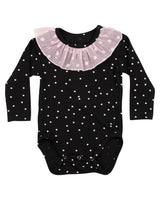 WAUW CAPOW by Bangbang Anna bodystocking is a long sleeved black body with white dots.The bodystocking features a wowen soft pink collar with small dots. Snap buttons on left shoulder and at the bottom. Practical and beautiful!