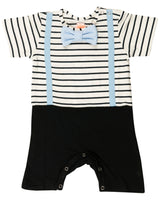 Wauw Capow by Bangbang Orlando is a short romper. The bottom part is black and it opens and closes with snap buttons. The top part is black and white striped and has some light blue suspenders and a bowtie. This romper has a relaxed dapper look for your little one.