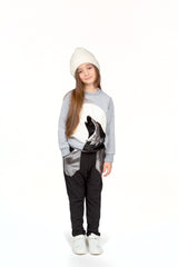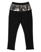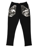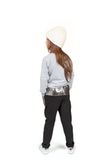 WAUW CAPOW by Bangbang Jackson, is a pair of black pants with an elastic waistband and folded cuffs. The pants have a shiny silver panel on the top back and shiny silver pockets on the front. These shiny silver pockets will make you stand out as if you were wearing jewelry. Jewelry looking pockets? Now that’s cool! Pair up with either the Iceland sweatshirt or the Hunter sweatshirt, to complete one of the coolest outfits at WAUW CAPOW.