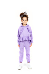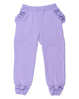 WAUW CAPOW by Bangbang Pancy Fancy, is a pair of purple, soft pants. The pants has and elastic waistband and elastics at the bottom of each leg. A ruffle is attached to both pockets, giving it a soft and feminine touch. You can dress this with any t-shirt you choose - the pants give give it that little something extra and make it look super cute. For the ultimate adorable and super cool look, we recommend wearing the pants with the Tea hoodie and the Glitter bow, just as Sia.