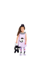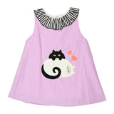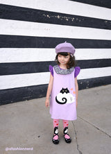 A purple A-Line dress in a soft cotton fabric. We have added a black/white striped ruffle collar and two cats to the dress for a cute addition. This dress has a one button closing at the back.