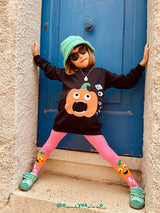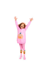 A fun pair of pink halloween tights, made in a soft organic cotton blend. On the front of each leg is an orange pumpkin and letters spelling out “Booooo”. These tights are perfect for Halloween and such a fun splash of color.