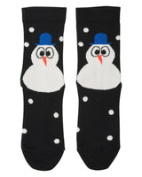 WAUW CAPOW by Bangbang Snowman, is a pair of black socks, featuring a white snowman in a blue bowler hat and carrot nose. White dots are also featured on the socks, that makes it look like snow. These tights is truly adorable socks and will make you wish for snow.
