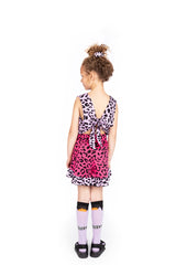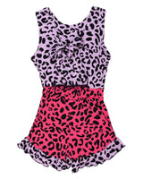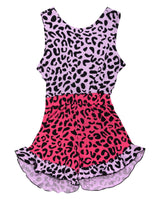 Columbia is our favourite playsuit of the summer! We have designed the perfect summer playsuit in purple and bright pink and cool leo print.  The playsuit has an open back tied with a knot and frilled shorts.