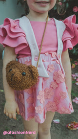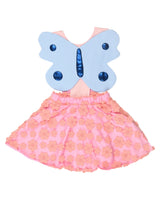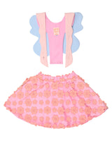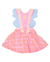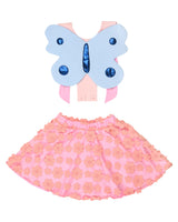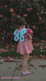 Stand out in the most captivating and charming way in our new Butterfly girl dress. This dress has an a-line skirt with an elastic waistband and detachable suspenders - and let's just talk about the combination of the pink skirt full of flowers, pink suspenders and blue butterfly wings on the bag - what a way to really stand out. We are totally in love!