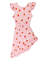 Our beloved Alia dress is back this season - now in a cute Strawberry print. This dress is perfect for any occasion! The asymmetric skirt gives the design personality and dynamic, while the strawberry pattern keeps the design playful. The dress has an open back tied with a knot, ruffle trimmings at the sleeves and bottom, and an elastic waistband for shape definition.