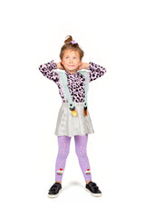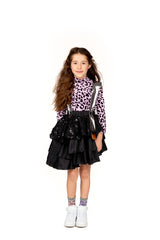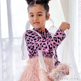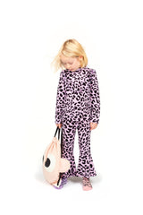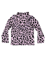WAUW CAPOW by Bangbang Ally is a purple leopard printed t-shirt with long sleeves. The t-shirt has a high neck and a ruffle on the front of the shirt. This t-shirt has a wild look to it, but the purple color gives it a softer touch and is absolutely adorable.