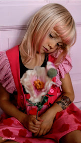 Our Bird Girl Frill dress is absolutely stunning and super cool. Stand out in the most captivating way, with two beautiful red swans wrapped around you. What a way to express yourself! This dress has an a-line skirt with an elastic waistband and detachable suspenders with ruffles that creates a small sleeve. And let just talk about the beautiful red flowers of the skirt - we are in love with this dress.