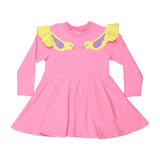 Our Dominika dress is back in a beautiful pink color, made from a soft organic cotton fabric. The fabric is brushed on the inside, for at soft and comfortable feeling. The skirt is round-cut, giving it a lovely fall and swing effect - it's perfect for twirls. We have added two beautiful yellow/purple birds to each shoulder, giving the dress a color block vibe.