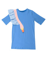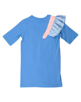 Shine in our beautiful blue Doris dreamer dress. This dress is such a special Wauw Capow piece and we are in love with this. It's simple with definitely has that Wauw magic that make all the difference. Doris has two layers of light blue ruffles that look just like swan wings. As soon as you start jumping, her wings start flapping! Doris’s neck is made out of a soft pink fabric that looks amazing on the blue dress. The color combination is beautiful in this dress.