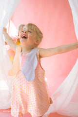 Lucy Dot is an A-line shaped dress made in a soft and beautiful fabric. The dress is in a dark nude-pink color with a sheer fabric on top with small green dots. The dress has a button on the top back.