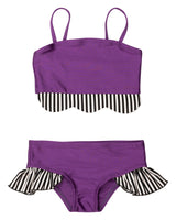 Break the waves in our Wanda Wave bikini set! Activewear has never been so cute! Wanda Waves features a vibrant purple material with black and white striped ruffle and scallop details.