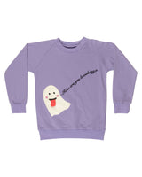 “…How are you boohing?” Our cute and friendly ghost is here and just loving the colder weather. Sitting on our soft sweatshirt in the most beautiful pastel purple color, it just isn't getting cuter than that, right?