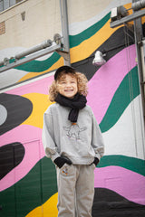 Our Skater sweatshirt is a super cool grey sweatshirt, made in the most comfortable soft organic cotton fabric, with a brushed inside for a soft fleecy finish. We have added a cool embroidery monster, who is skateboarding, to the front for a fun Wauw Capow finish. The bottom of the sweatshirt and sleeves have a rib edge.
