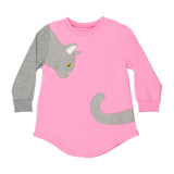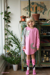 Our Sally dress is absolutely adorable. Made in a pretty pink color, an organic cotton fabric and with a brushed inside for a soft finish, this dress is perfect for those colder days to come. The bottom is made in a slightly rounded curve, for fun and different look. We have added a grey cat and tail application, to the front of the dress, for a fun Wauw Capow feeling. The cat is made in a faux suede fabric and is very soft. For a more asymmetrical finish we have made one sleeve grey and the other pink - What's not to love.
