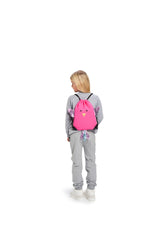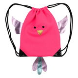 Our bird bag with black drawstrings is made in a soft, electric pink fabric and has bird applications on the front and purple metallic wings and tail. This bag has no lining.
