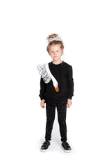 Immerse yourself into our Wauw Capow fairytale and let yourself be hugged by Dreamy, our friendly swan. Dreamy is made of a black dotted light material and is sewn on a black sweatshirt made of organic cotton. Dreamy’s wings will start flapping as soon as you start jumping!