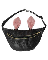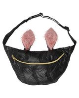 Jayden is our super cool bum bag. He has fluffy rabbit ears and is made of a padded black fabric - he's very soft.